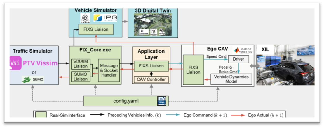 FIXS: The communication hub that connects simulation tools and hardware, standardizing message types for vehicle status (such as position, speed, acceleration, lane ID), traffic signal states, and detector information for signal controls.