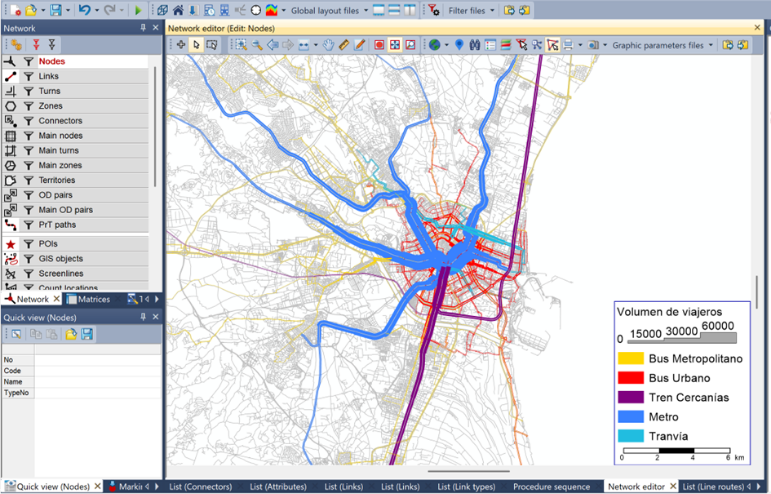 The existing PTV Visum model of the Valencia Metropolitan Area is built with detailed mobile phone data. Even though the emergency affected nearly all major origin–destination relations, the four-step model allowed us to capture essential passenger demand patterns. It also provided key service-level indicators such as accessibility, journey times, transport supply, and activity patterns for a typical working day during peak hours.