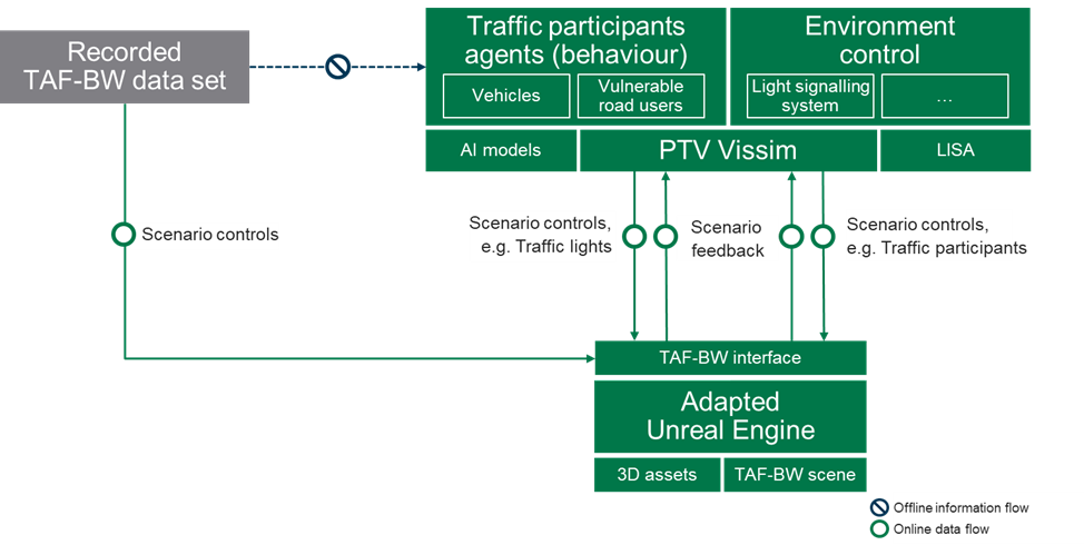 External simulators like PTV Vissim, can control the simulation via this standardized interface, e.g. update the driving state of each vehicle as well as get updates on the current state of the environment.