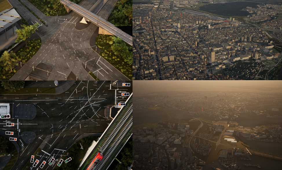 The digital twin provides realistic 3D scenarios, featuring physically calculated lighting and weather effects. Road markings, signage, vegetation and building façades are generated using photogrammetric reconstruction methods and open geodata. User can dynamically adjust the traffic density, time of day, season and weather conditions can be dynamically adjusted including fog, rain and wet road surfaces, via an intuitive interface.