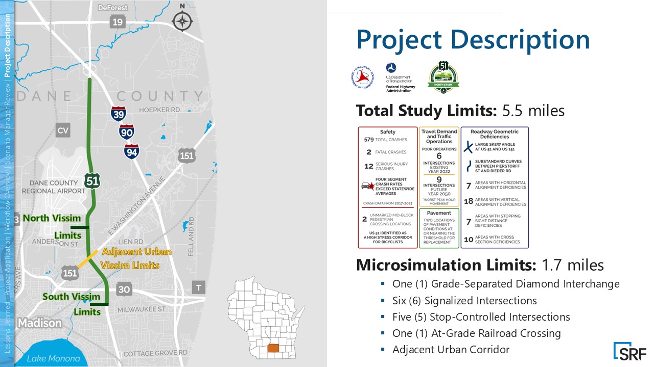 We modeled ~1.7 miles of the US‑51 highway in Dane County, south‑central Wisconsin. The study area includes a diamond interchange, six signals, five stop‑controlled intersections, a railroad crossing, and the US‑151 junction – the primary approach to downtown Madison.