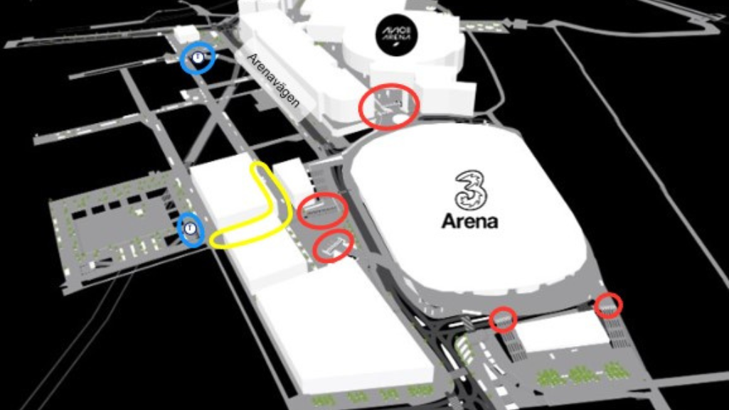 Our model covered Avicii Arena and 3Arena on the eastern side of Arenavägen. Because the metro entrances are on the western side, visitors must cross Arenavägen to reach the station – either at designated crossings or via the bridges connecting Evenemangstorget to the arena district.